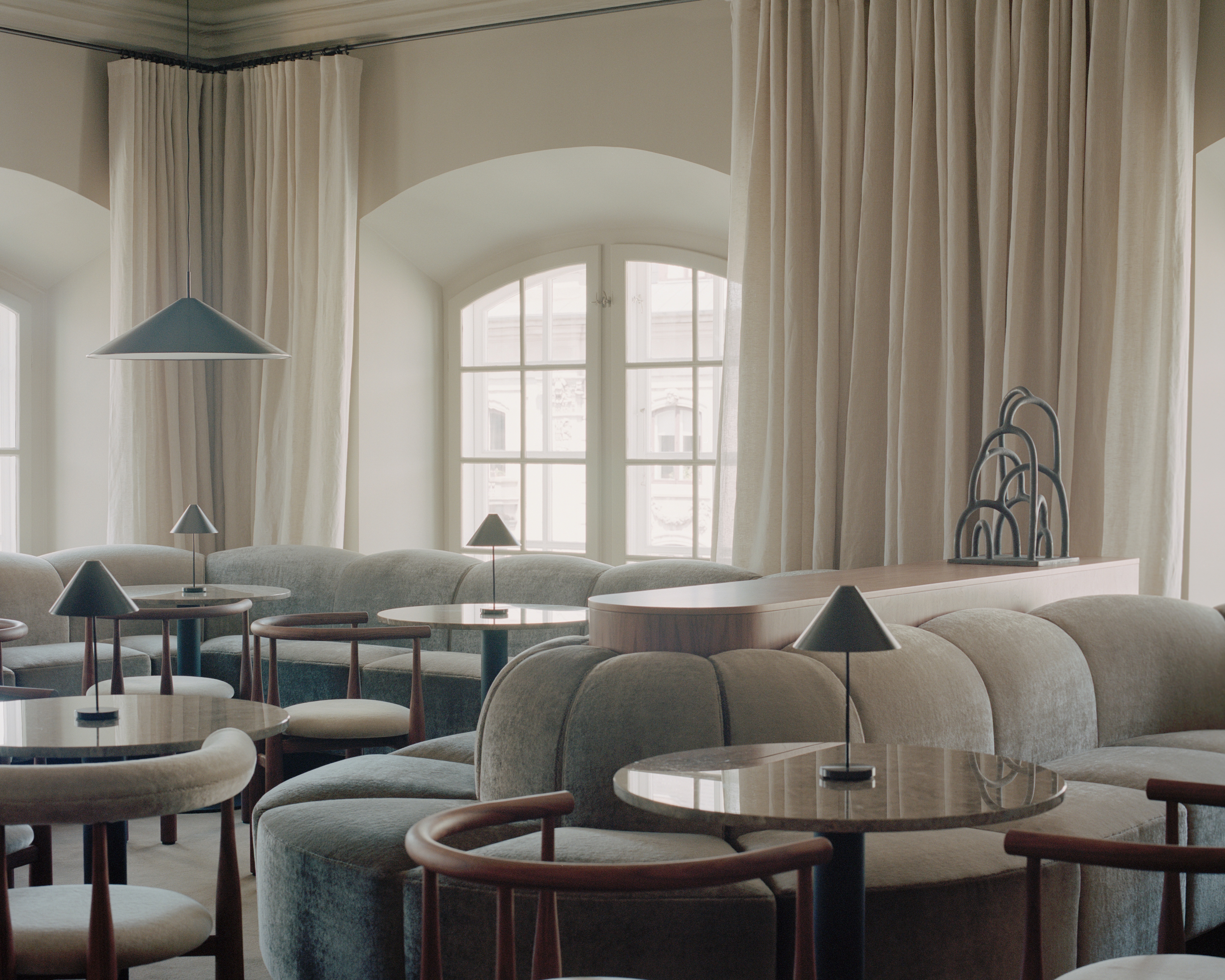 I hotellets bar kan gæsterne nyde et udvalg af champagne, særligt udvalgt af Champagne Taittinger, en nyligt velkommen residence partner hos New Works. Lokalet er designet med fleksibilitet i tankerne og er møbleret med den nye Shore Modular Dining Sofa, som kan kombineres på forskellige måder for at transformere rummets layout. Den bølgende sofa kombineres med de nye Florence Column Table og variationer af Bukowski Chairs, hvilket tilbyder en intim og eksklusiv atmosfære, fremhævet af den spektakulære udsigt til Marmorkirken.