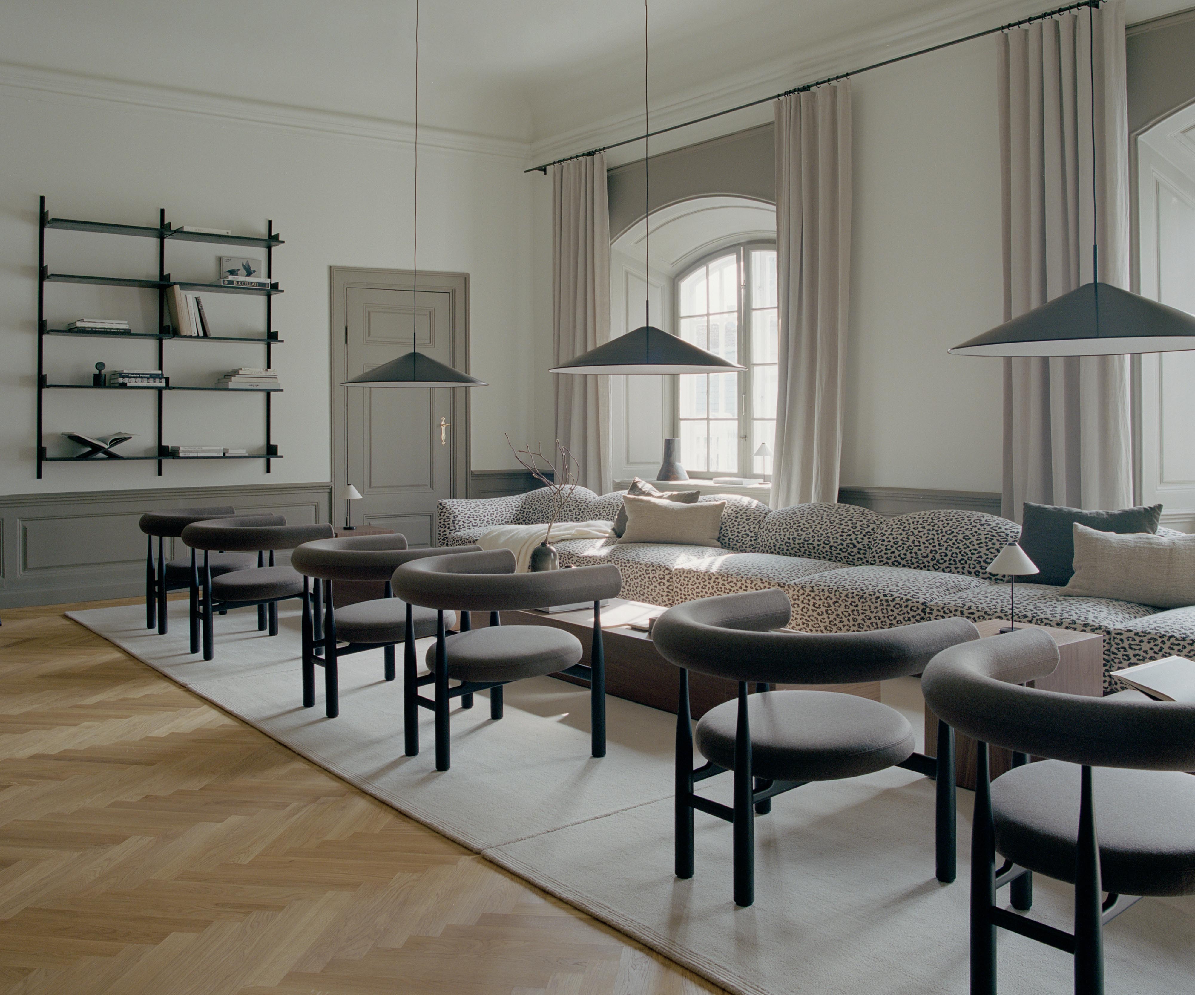Blandt hotellets faciliteter er et komfortabelt mødelokale, der henvender sig til forretningsgæster. Dette behagelige rum har voluminøse silhuetter i møbler og belysning, der modsvares af de bløde toner i finish og tekstiler. Et langt Atlas-bord, ledsaget af robuste, polstrede Covent Club-stole og de nye Kantarell-pendler, formidler en professionel atmosfære, samtidig med at de opretholder et varmt og elegant udtryk.